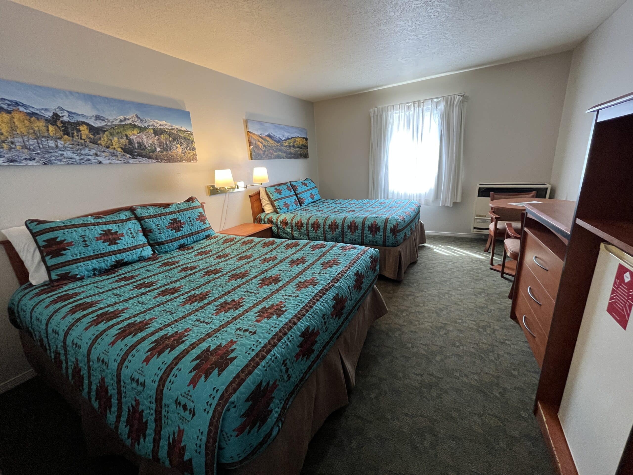 Hotel rooms are a typical hotel style with 1 room featuring 2 queen sized beds with a full bathroom. Each room contains a microwave and mini fridge and sleep a maximum of four. BOOK NOW