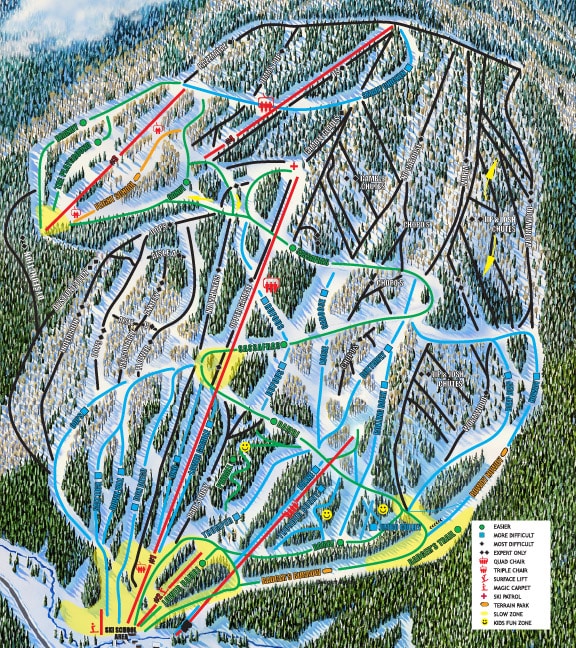 Expert Trails (Black Diamond) – 40% of our trails are advanced are expert and included gladed tree skiing and steep, backcountry-like terrain.
